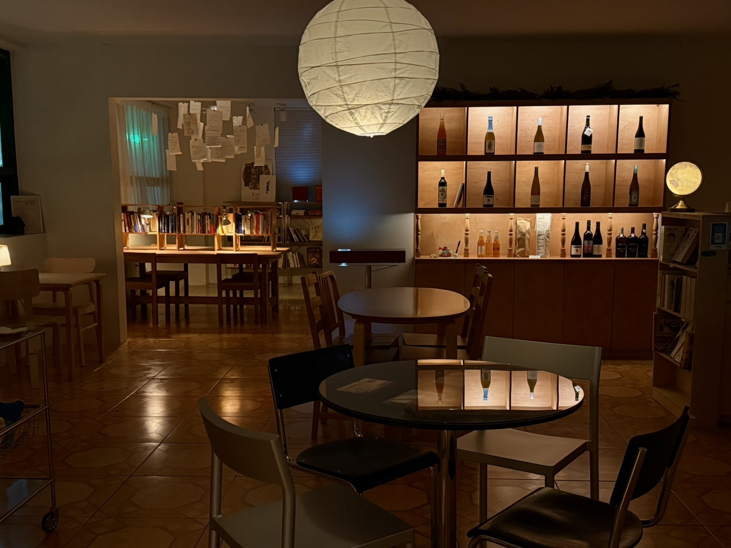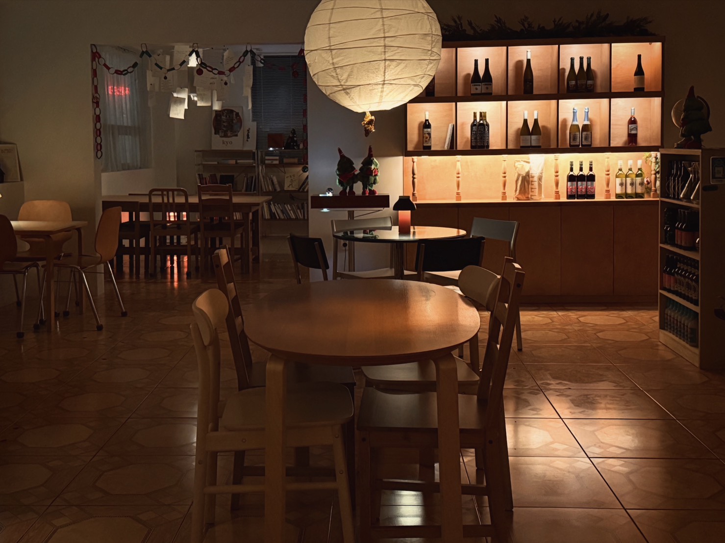 가장 큰 테이블의 중앙에 놓여있던 책장을 치운 뒤 없어서 아쉬웠던 단체 테이블로 활용하고, 와인을 판매하는 선반은 메뉴에서 와인을 대부분 빼면서 정리하기로 했어요. 한 켠에 놓여있던 책장은 술을 보관하고 진열하는 것으로 사용하게 되었습니다.